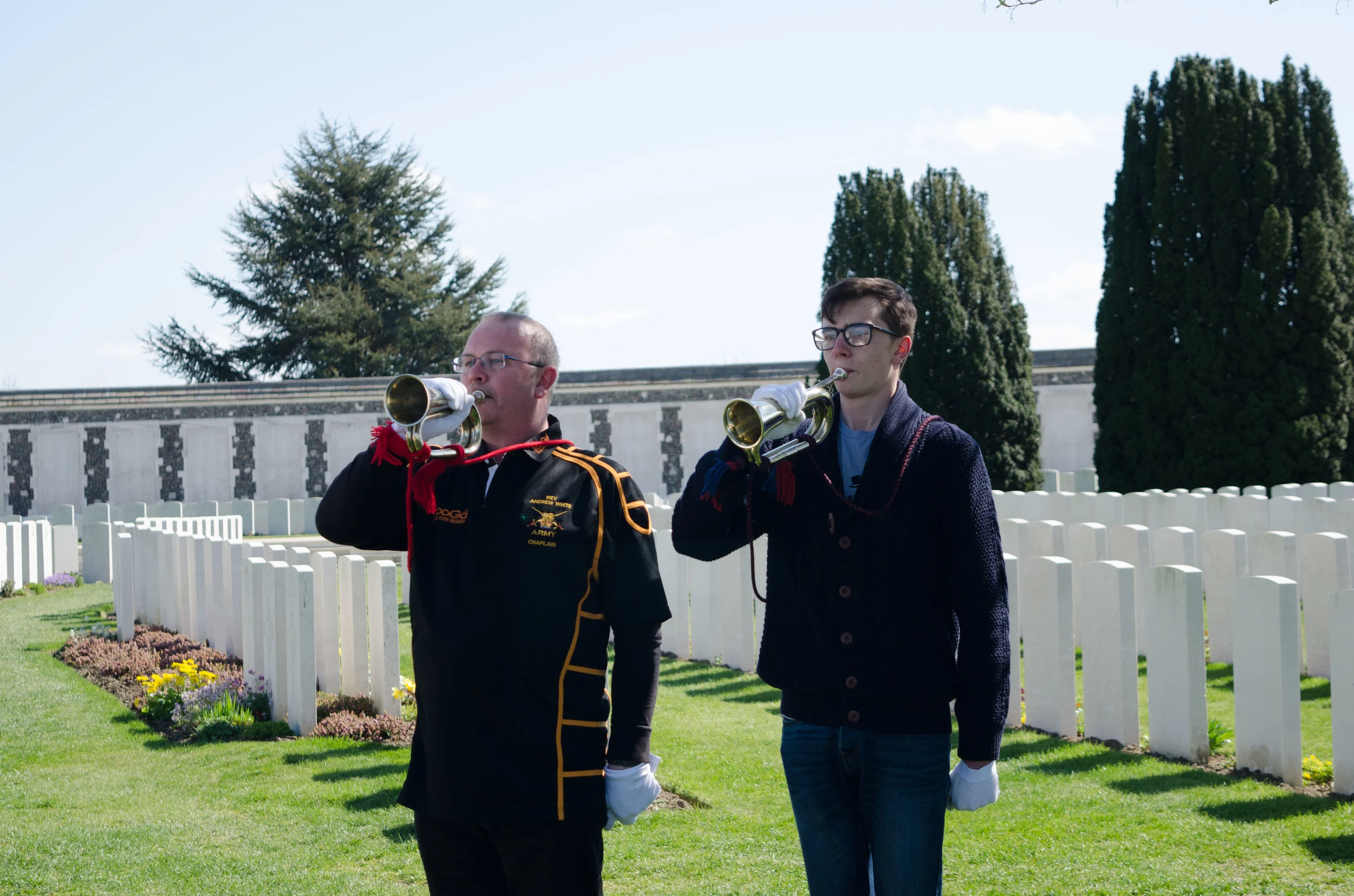 We were lucky enough to have a duo on the bugles to play the last post as we gathered at the Cross of Sacrifice for a lovely memorial service. As I looked up from my order of service sheet, I saw how the group of 55 had doubled in number as other visitors to the cemetery came to pay their respects alongside us.