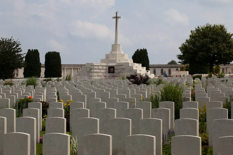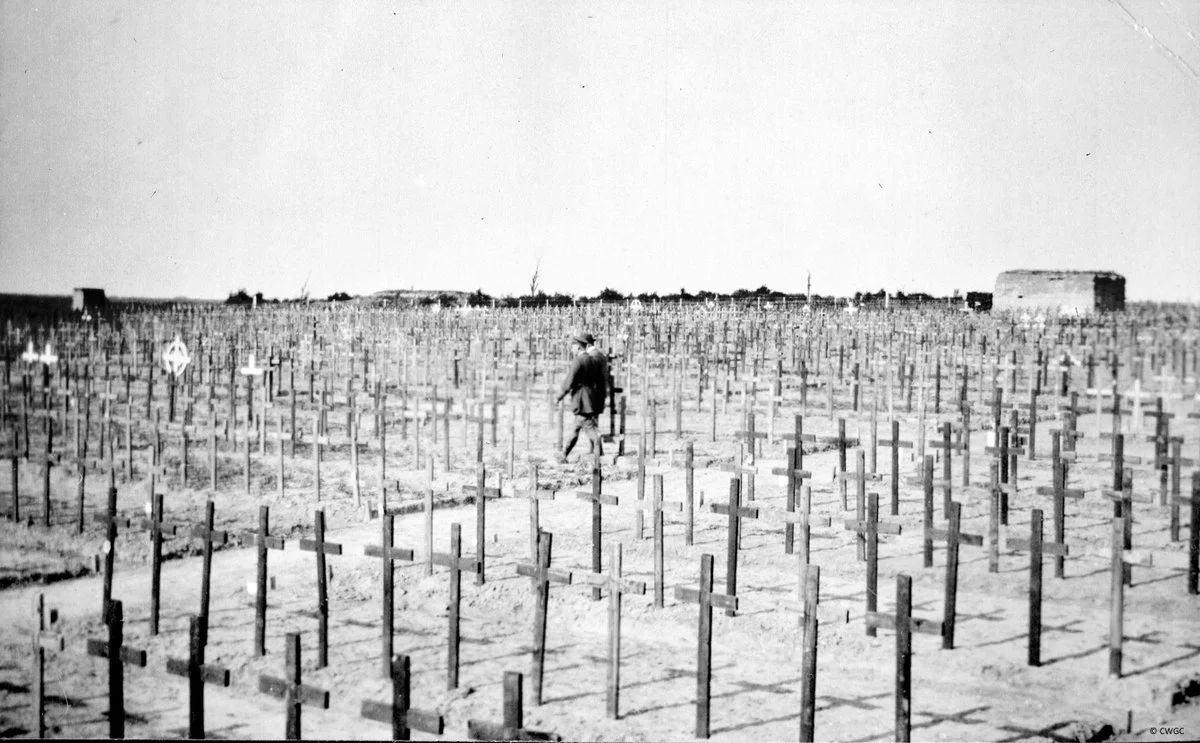 Below is an image taken at Tyne Cot Cemetery 100 years ago and below that a modern view.